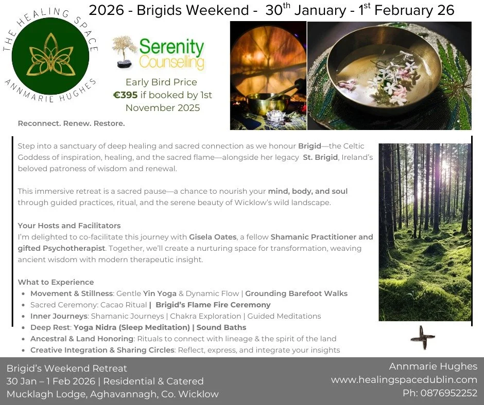 Brigid's Weekend Retreat Friday 30 January 2026 12:00 Sunday 1 February 2026 14:00 Mucklagh Lodge Agahavannagh Wicklow Ireland (map) Google Calendar ICS